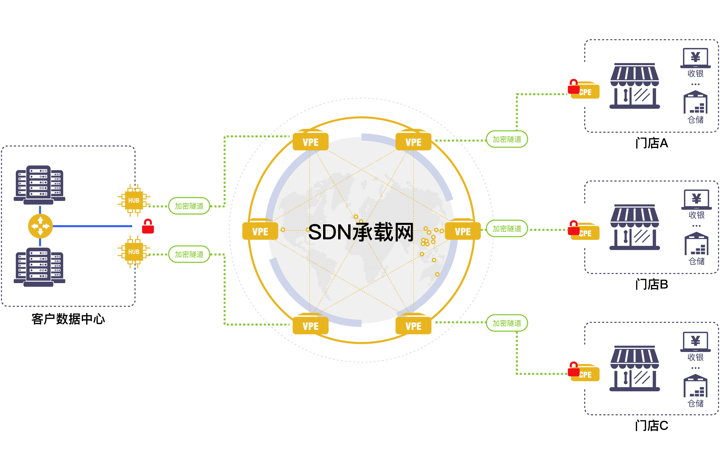 基于犀思云SDN承载网构建SD-WAN网络,实现总部与门店之间的广域网连接。