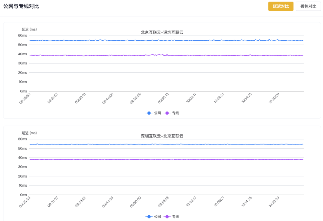 2、网络延迟结果:北京-深圳的公网与专线(最近一小时)