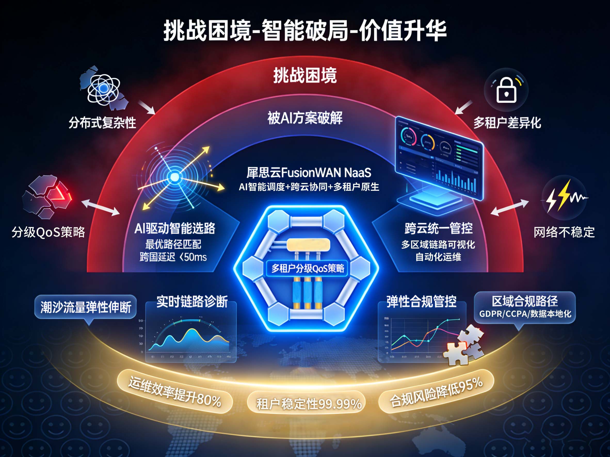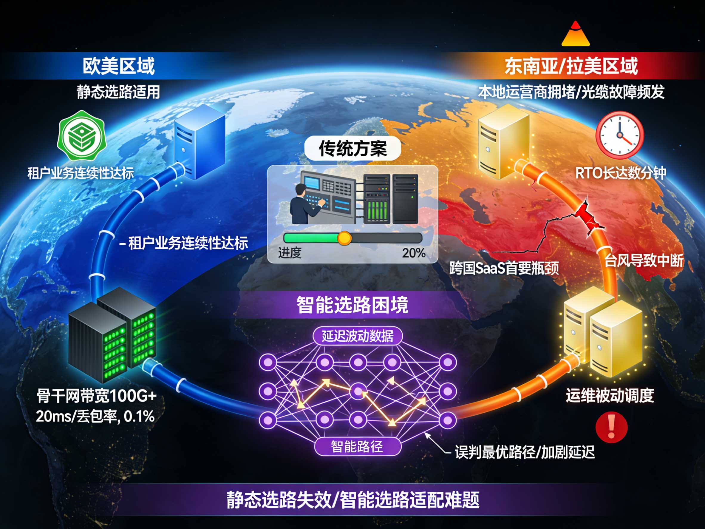 静态选路策略根本无法应对这类动态变化:一旦某条链路突发故障(如台风导致跨境链路中断),传统方案需运维手动切换路由,恢复时间目标(RTO)长达数分钟,远超租户对业务连续性的要求,也让运维流量调度优化陷入被动。