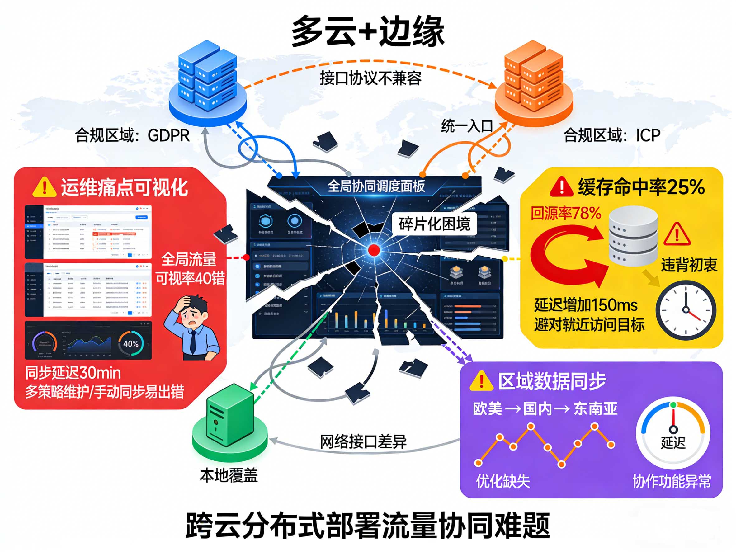 出海SaaS企业多采用“多云+边缘节点”的混合架构,以适配不同区域的租户需求与合规要求——例如在AWS部署欧美租户节点、阿里云部署亚太节点、边缘机房覆盖东南亚本地租户。但不同云厂商、节点的网络接口、调度协议不兼容,导致跨云流量协同调度陷入“碎片化”困境,难以实现全局协同,跨云分布式部署如何实现流量协同也成为运维团队的高频难题。