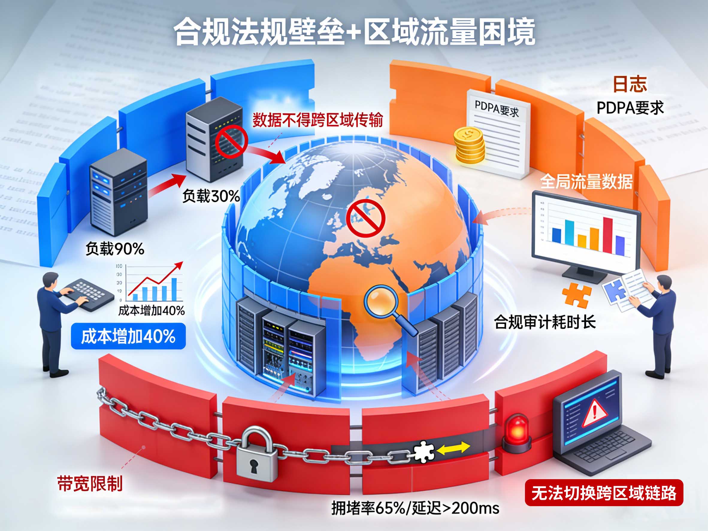 全球不同区域的数据合规法规,对流量传输路径提出了严格限制,直接制约流量调度的灵活性。运维团队需在保障租户体验的同时,满足差异化的合规要求,往往陷入“体验与合规”的两难境地。例如,欧盟GDPR明确要求租户数据不得跨区域传输,即使欧洲节点负载过高,也无法将流量调度至邻近的中东节点分担压力,只能被动扩容本地带宽,增加成本;东南亚PDPA则要求留存租户级流量访问日志,传统调度系统仅能记录全局流量数据,无法精准追溯单个租户的流量路径,合规审计时需运维手动拼凑数据,耗时耗力。