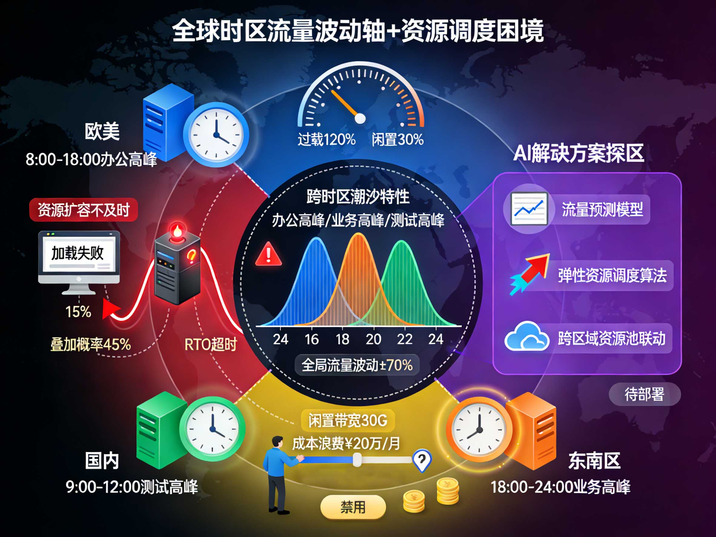 出海SaaS的租户分布在不同时区,流量呈现显著的“跨时区潮汐特性”——欧美租户白天的办公高峰、东南亚租户夜间的业务高峰、国内研发团队的测试高峰可能叠加,导致全局流量波动剧烈。