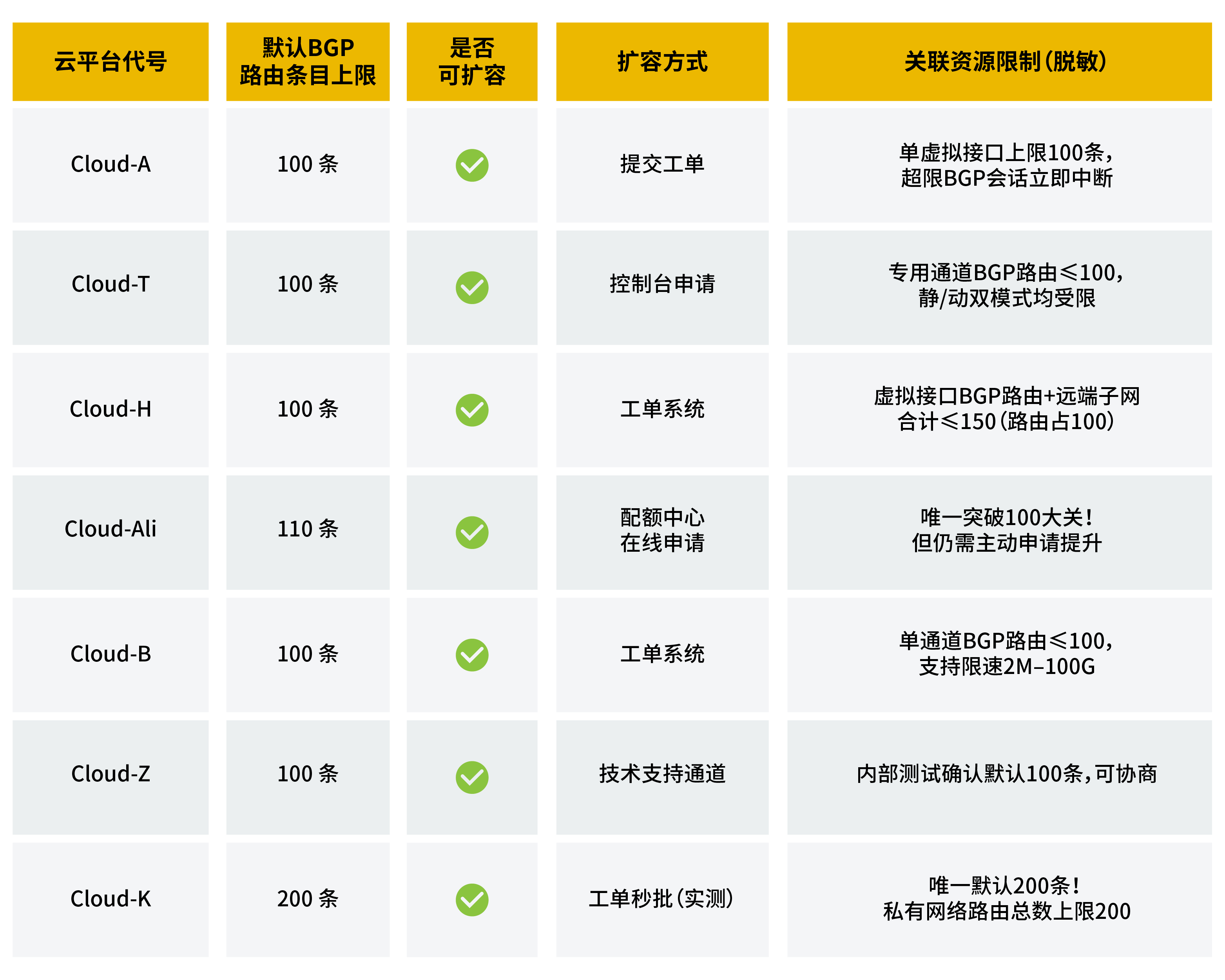 各大主流云平台,对单个虚拟接口/专线通道/BGP会话的路由发布数量均有硬性限制,超限直接导致BGP会话重置,流量中断 —— 且往往无预警、无缓冲、无自动恢复!
