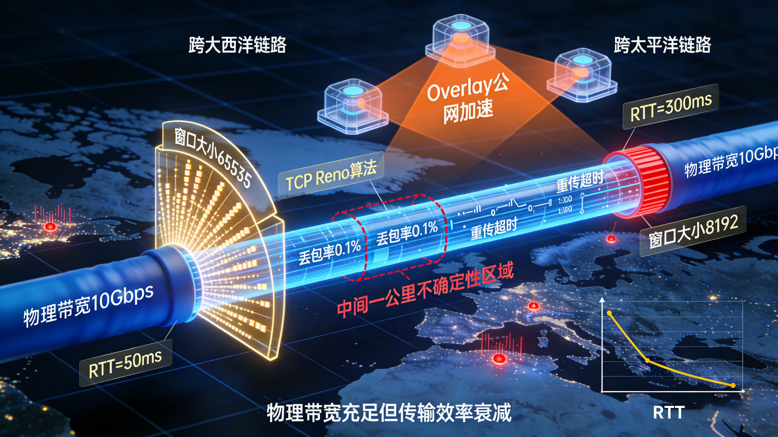 在真实的跨国公网环境下,RTT 的增加会导致 TCP 滑动窗口收缩,即使物理带宽充足,实际传输效率也会呈指数级下降。许多运维 尝试通过增加公网加速节点来缓解,但这种 Overlay 方案无法根本解决“中间一公里”的确定性问题。