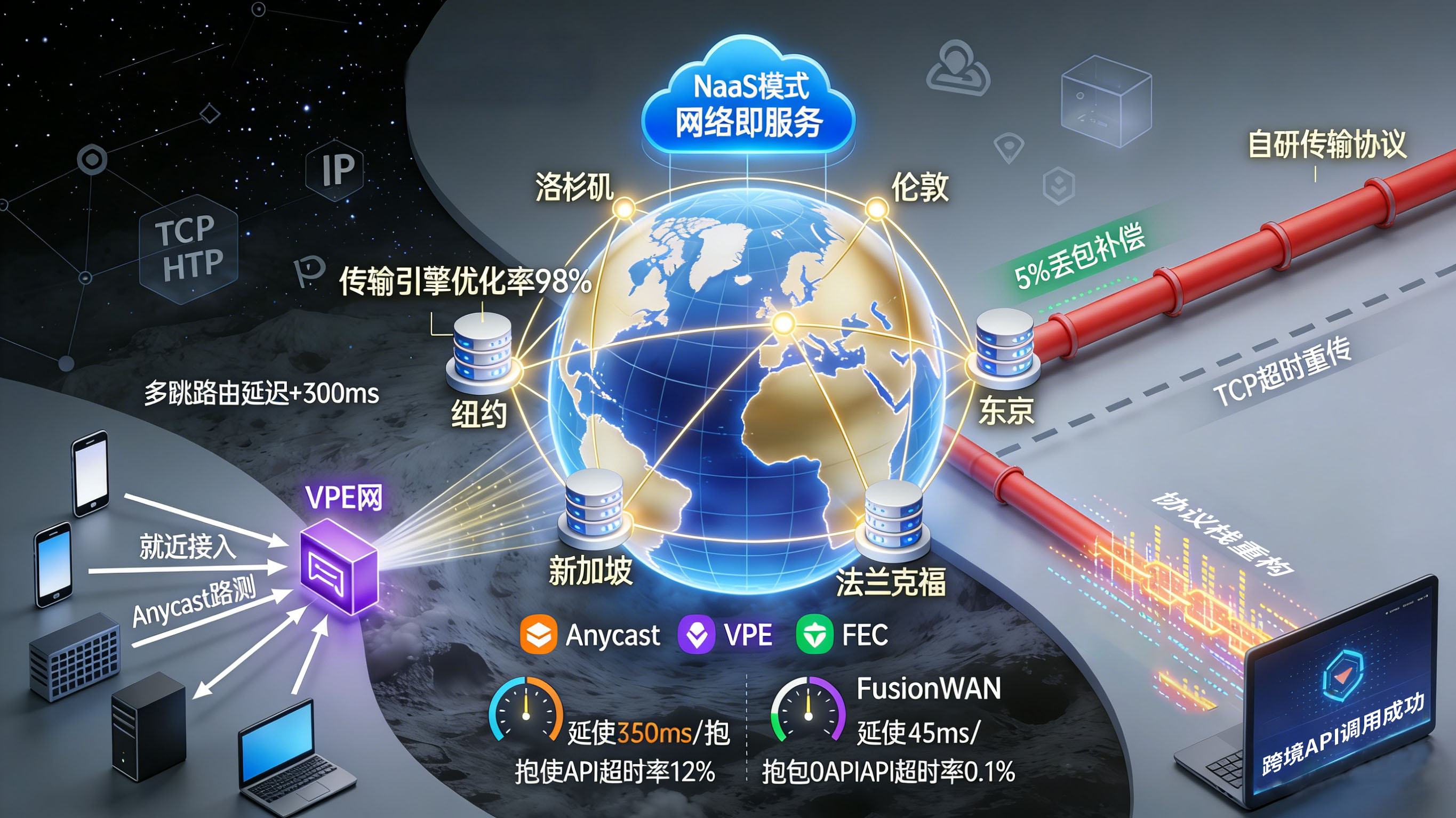 ✅ 路径优化与协议栈重构:在骨干网内部,FusionWAN 弃用了标准的 TCP 协议,转而采用自研的高性能传输协议。通过 FEC(前向纠错) 技术,即便在跨境链路出现 5% 随机丢包的情况下,依然能保障 API 调用不超时。