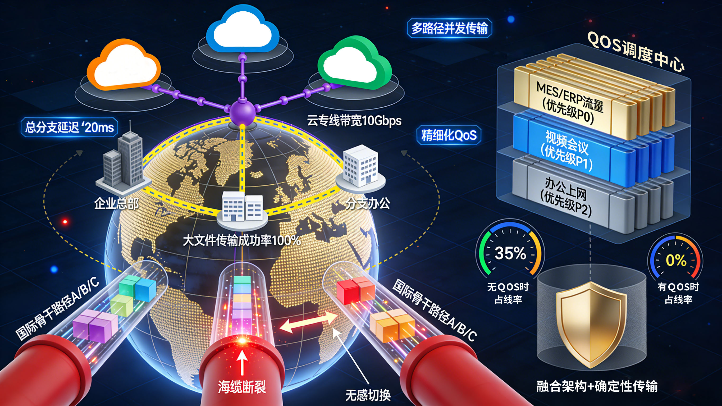 ✅ 多路径并发传输(Multi-Path):将海量研发数据切片,同时通过多条国际骨干路径传输,互为冗余。即便某条海缆断裂,业务也能无感切换,确保了 大文件跨境传输的确定性。